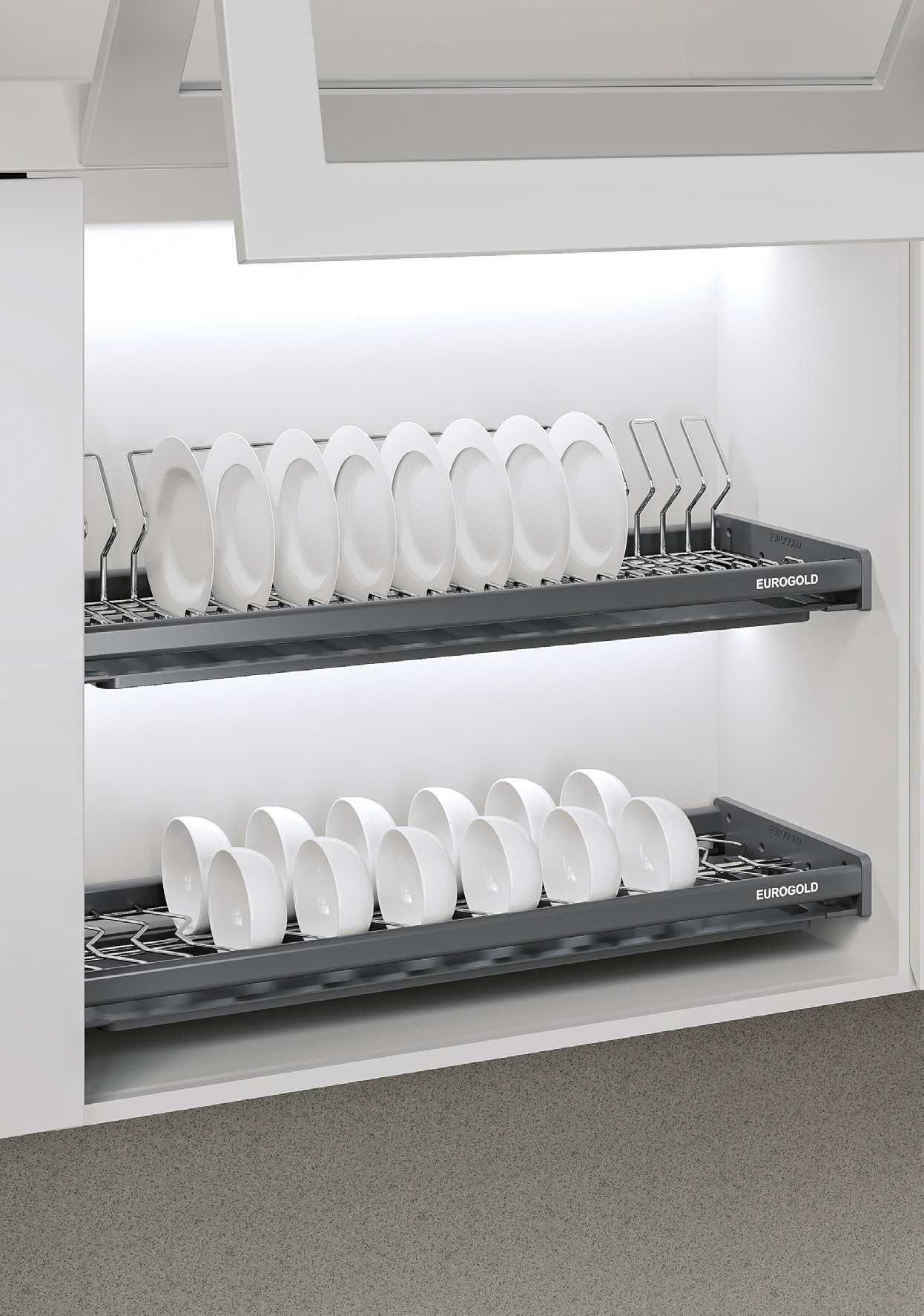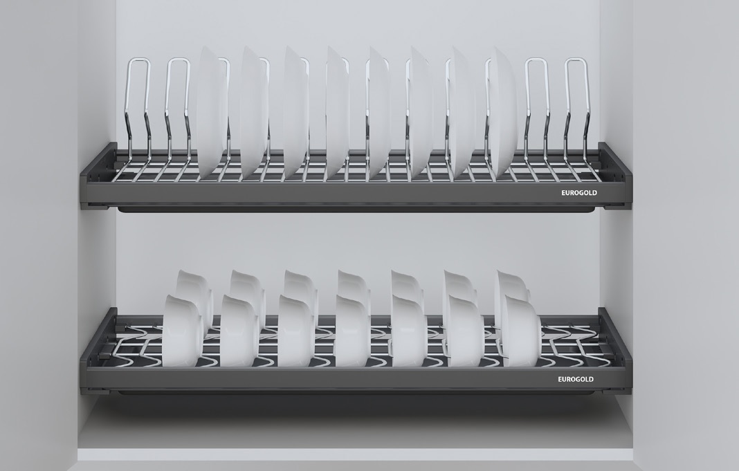 Dòng kệ chén bát cố định 2 tầng nan Oval thiết kế đẹp mắt, sang trọng và phù hợp cho hầu hết các loại tủ trên phổ biến từ 600mm – 900mm.